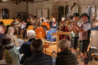 Einen wunderbaren Volksmusikabend boten die Musiker in Museum Klaushäusl. Im Vordergrund spielen die ReDur Bläser mit von rechts Vitus Voit und Kilian Nißl. Dahinter hören die Bolzwanger Geigenmusi und das Wössner Erntedank Ensemble zu.