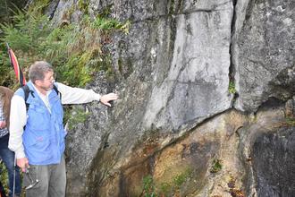 Dr. Darga zeigt den Riss in der Gesteinswand zu den erklärten Ursachen