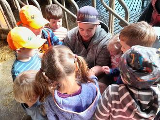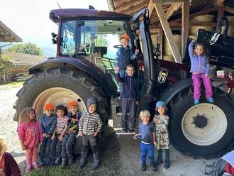 Auf unseren regelmäßigen Wanderungen zum Alpbach oder den umliegenden Wäldern in der Au begegnen uns häufig die Kalbinnen und Milchkühe des Knogglerbauern. Ebenso werden wir stets freudig, von ihren neugierigen lustigen Ziegen begrüßt. Somit war ein Bauernhofbesuch beim Knoggler naheliegend, zumal er fußläufig leicht vom Waldkindergarten zu erreichen ist. Thomas Pletschacher und Michael Seebauer bewirtschaften den idyllischen wunderschönen Knogglerhof gemeinsam mit Sohn Michael Pletschacher, von dem sie tatkräftig unterstützt werden. Zuerst zeigte Michael Seebauer den Waldkindern die kleinen Kälber in ihren Boxen. Besonders angetan waren die Kinder von einem neugeborenen Kälbchen, das erst am Tag zuvor auf der Weide geboren wurde. Anschließend führte Michael Pletschacher die Kinder durch den Stall und erklärte ihnen die Mistanlage und die verschiedenen Futtermittel für die Rinder, dabei beantwortete er geduldig die Fragen der Kinder und Erzieherinnen.