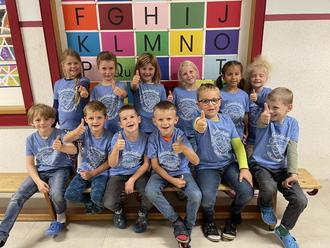 Die Erstklasskinder zeigen munter, dass sie jetzt dazugehören. Stolz tragen sie die Schul-T-Shirts, die sie vom Elternbeirat geschenkt bekommen haben. Vielen, vielen Dank.