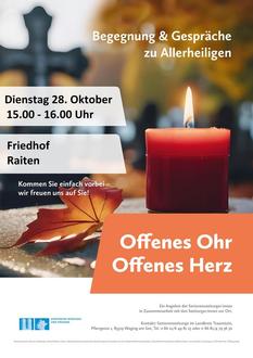 Die Seniorenseelsorge des Dekanates Traunstein und die Seelsorger und Seelsorgerinnen vor Ort möchten den Menschen auf den gemeindlichen Friedhöfen die Gelegenheit zu einem Gespräch und zur Begegnung bieten. Dieses Angebot steht zu den angegebenen Zeiten allen offen, unabhängig von ihrer Religionszugehörigkeit.