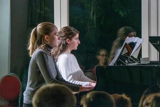Eine ganz andere, durchaus verträumte Atmosphäre zaubert das Klavierduo Naomi von Schroeders und Madeleine Hooper (Klasse B. v. Kutzschenbach) mit den impressionistischen Klängen des „Andante“ von Charles Koechlin aus dessen Suite op. 6. Sie sind seit Jahren ein festes Duo und das merkt man ihrem feinfühlig aufeinander abgestimmten Spiel an.