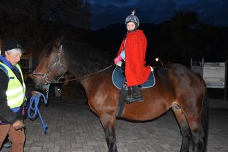 Bei der Rückkehr zum Dorfplatz wurden die Kinder von der Jugendkapelle unter Leitung von Marlene Noichl mit Musik empfangen. Sodann konnte das zahlreiche Publikum das Martinsspiel mit dem hungrigen und frierenden Bettler (Finley Judson) und zahlreichen Mitspielern sowie dem Heiligen Martin (Anna Roebke) auf seinem Norika Pferd Flicka gespannt verfolgen.