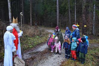 Schleching – In den Baumwipfeln rauschte der Sturm, während die Kinder des Waldkindergartens den Nikolaus und seinen Engel suchten, die ja an diesem Tag vom Geigelstein herunterkommen sollten. Schon Tage vorher hatte Irmi Klauser, die Leiterin des Waldkindergartens, die Geschichte vom Heiligen Nikolaus erzählt und von dem Geschenkesack, der ein Loch hatte. So suchten die Kinder nach Spuren im Wald, die darauf hindeuteten, dass der Nikolaus vor Ort ist.