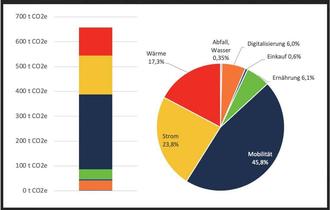 Gleich im Oktober startet der Arbeitskreis Klimaschule darunter mehrere Lehrkräfte in Zusammenarbeit mit den Schülerinnen und Schülern des Wahlkurses Klima und Umwelt. Ausgewertet wurde die schon im letzten Schuljahr begonnene Treibhausgas-Bilanzierung des Gymnasiums. Untersucht wurden hier die acht Bereiche Abfall, Digitalisierung, Einkauf, Ernährung, Mobilität, Strom, Wärme und Wasser. So wurde zum Beispiel im Rahmen einer Mobilitätsumfrage, die sich an die gesamte Schulfamilie richtete, Daten zur Schulweglänge und Transportmittel für jedes einzelne Schulmitglied ermittelt und zusammengefasst.