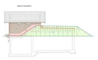 Ansicht der Außen-Anlage mit Erdhügel, Haus und den darunter liegenden Hochbehältern