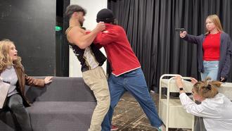 Foto von links nach rechts: Sophie Langer, Johannes Ahmetsberger, Linus Straßer, Carmen Faust, Elena Schwemmer (mit Waffe)