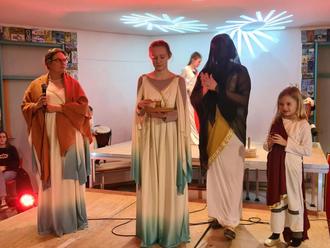 Im Vordergrund von links nach rechts: Astrid Russ (Lateinlehrerin), Liv Russ (als Opferdienerin, 9. Klasse), Sandra Altmann (Lateinlehrerin als Magierin in schwarzem Schleier), Luisa Altmann (Opferdienerin, 1. Klasse). Im Hintergrund mit Trommel links Tessa Pallas (11. Klasse) und gehend hinten Mila Zumbeel (7. Klasse)