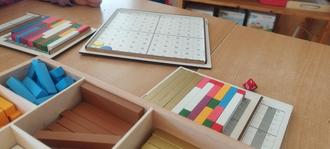 Das Montessori-Material “Stäbchenreise” fördert spielerisch das Rechnen und ist auch bei unseren Hortkindern sehr beliebt.