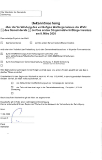 Nächster Artikel: Bekanntmachung der Sitzung des Wahlausschusses zur Feststellung des abschließenden Ergebnisses der Wahl des Gemeinderates, d.ersten Bürgermeister(in) am 08.März 2026