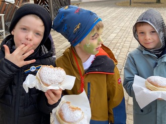 Munteres Treiben herrschte am letzten Schultag vor den Faschingsferien in der Pause: Ein trillerpfeifenbewehrter Clown tauchte mit seiner Mannschaft auf und ehe man sich`s versah, war schon der Puderzucker von köstlichen Krapfen auf den Nasen von Hexen, Robin Hood, Harry Potter, Rotkäppchen, Cowboys, Indianern und vielen anderen bunten Gestalten gelandet. Vielen Dank an den Elternbeirat, der sich diese herrliche Überraschung ausgedacht und organisiert hat und an die Bäckerei Pretzner, die Krapfen für die ganze Schule spendiert hat.