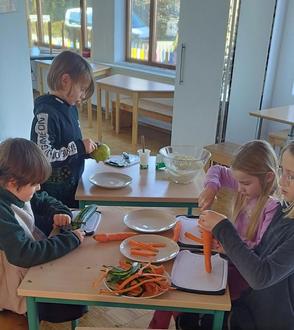 In der Grundschule des Montessori-Hauses haben wir bereits Kresse angepflanzt, verschiedene Variationen von Apfelschnitzen und Gurkenscheiben getestet und Apfeltee gemacht. Im Rahmen des Unterrichts fand auch ein Info-Kreis zum Thema Gesundheit statt.