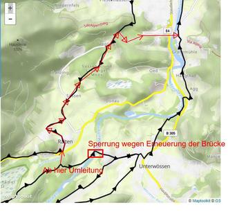 Aus Kostengründen und um die Bauzeit so kurz wie möglich zu halten, ist es erforderlich, die Brücke für Fahrzeuge, Radfahrer und auch Fußgänger voll zu sperren. Die Sperrung, die ab der Abzweigung der Gemeindeverbindungsstraße von der B 307 gilt, wird voraussichtlich bis 30. September 2024 andauern. Die Umleitungsstrecke für Autos führt über die B 307 nach Marquartstein und über die B 305 nach Unterwössen.