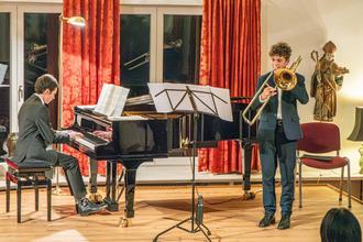 Hier in der Generalprobe wussten Anian Fakler (Posaune) und Fritz Knab (Klavier) noch nicht, dass sie die Hürde des Regionalwettbewerbs mit Maximalpunktzahl nehmen. Im Wettbewerb in Traunstein erreichten sie den ersten Preis.