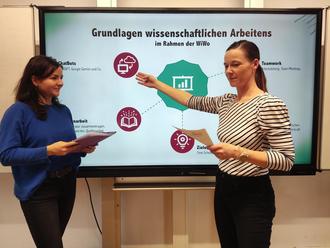 Das Foto zeigt von links nach rechts: Simone Heinrichsberger (sie betreute eine Schülergruppe während der Wissenschaftswoche) und Franziska Ehrl (Projektleiterin der Wissenschaftswoche) beim Vortrag vor den Elftklässlern zum wissenschaftlichen Arbeiten.