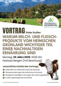 In seinem Vortrag erläutert er die große Bedeutung der Grünlandkuh für den Arten-, Natur- und Klimaschutz. Um diese Art der Graslandbewirtschaftung zu erhalten, sind nicht nur nachhaltig arbeitende Betriebe nötig, sondern ebenso aufgeklärte Verbraucherinnen und Verbraucher. Denn nur durch die gezielte Nachfrage nach Milch- und Fleischprodukten vom heimischen Grünland kann die einzigartige Kulturlandschaft des Alpenraums und des Voralpengebiets langfristig bewahrt werden.