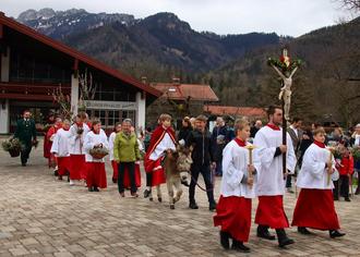 Viele Gläubige fanden sich am Sonntag zur Palmweihe, mit ihren schön gebundenen Palmbuschen, auf dem Dorfplatz in Schleching ein. Feierlich zogen Pfarrer Strasser und Diakon Braun, die Ministranten und die Mesner auf den Dorfplatz. Der Zug wurde angeführt von einem Ministranten, der auf einem Esel ritt. Feierlich wurden die Palmbuschen gesegnet und Pfarrer Strasser erinnerte daran, dass mit dem Palmsonntag die Karwoche beginnt.