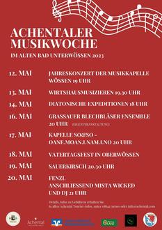 Traditionell starten die Achentalgemeinden Mitte Mai alljährlich mit Jahreskonzerten und Standkonzerten in die Musiksaison. Dieses Jahr präsentiert die Gemeinde Unterwössen im Alten Bad erstmalig vom 12. Mai - 20. Mai 2023 die Achentaler Musikwoche mit einem bunten musikalischen Programm mit verschiedenen Akteuren aus der Region.