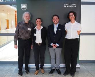 Foto (v.l.n.r.): Energieexperte Peter Pospischil, Projektmanagerin Klimaschutz Johanna Schneller (beide Energieagentur Südostbayern), Erster Bürgermeister Hans-Peter Dangschat und Franziska McKay (Steuerungs- und Klimamanagement, Stadt Traunreut) beim Auftakt der Aktion „Check Dein Haus“ im k1 in Traunreut.