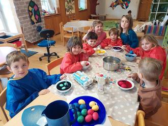 Bei uns war vor Ostern einiges los. Wir Kinder färbten insgesamt rund 100 Eier, von denen uns der Osterhase einige stibitzte und in unsere Osternester legte. Die anderen aßen wir, zusammen mit unseren selbstgebackenen Hasenbrötchen, zur Osterfeier. Mit Liedern wie „Stups der kleine Osterhase“ und „Hoppelhase Hans“ lockten wir bei offenem Fenster den Osterhasen an. Auch andere Angebote wie das gemeinsame Erarbeiten der Ostergeschichte durch ein Bilderkino & Legebild oder eine Osterhasen – Stuhlpercussion, bereiteten uns große Freude.