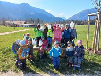 Auch bei der Müllsammelaktion der Gemeinde, waren wir dieses Jahr wieder sehr fleißig und erfolgreich. Trotz des kalten Wetters wollten wir es uns nicht nehmen lassen, uns an der Aktion sauberen Landschaft zu beteiligen. Wir sind in zwei Gruppen losgezogen in unterschiedliche Richtungen. Die Schmetterlinge und großen Raupen haben an der Straße durch Schleching bis zu den Achenwiesen gesammelt und die kleinen Raupen haben auf den Feldwegen rund um den Kindergarten gesucht. Unsere Kinder staunten wie viel Müll wir zusammengetragen haben und beschäftigten sich mit Fragen wie: „Warum lassen die Leute so viel Müll rumliegen und wie können wir es ändern? Es könnten sich doch auch Tiere verletzen.“ Zur Stärkung gab es im Anschluss im Kindergarten dann noch Brez´n und Getränke für alle Kinder.