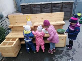 Seit ein paar Wochen schmückt unseren Hof eine neue Matschküche. Ganz individuell nach unseren Wünschen hat dieses Schmückstück Mario Radman gebaut. Die Materialien haben seine Chefs Patrick Bindrum und Klaus Hayer vom Bauunternehmen Bindrum spendiert. Die Kinder sind begeistert. Wir sagen allen drein, herzlich Dankeschön!