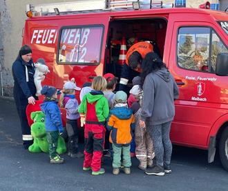Ein weiterer Höhepunkt war unser Besuch bei der Freiwilligen Feuerwehr Maibach. Ein herzliches Dankeschön geht hier an den 1. Kommandanten Florian Glück und die 2. Kommandantin Ramona Weißenberger. Beide haben sich viel Zeit für uns genommen und uns praxisnah den Feuerwehrwagen und seine vielfältige Ausstattung erklärt. Die Kinder durften verschiedene Jacken und Helme anprobieren und stellten schnell fest, wie schwer eine echte Feuerwehrjacke sein kann! Auch die Ausrüstung einer Feuerwehrfrau bzw. eines Feuerwehrmanns wurde ausführlich gezeigt. Besonders spannend war das Aufhängen und Trocknen der Schläuche und zum Abschluss durften die Kinder selbst beim Aufrollen mithelfen. Als Überraschung gab es für unsere Wiesengruppe noch ein Feuerwehr-Maskottchen in Drachenform und für jedes Kind ein Lernheftchen ganz herzlichen Dank für diesen besonderen Einsatz!