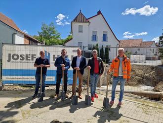 Auf dem Bild (von links): Dirk Schlereth, Bauleiter Fa. Hell; Matthias Kirchner, Inhaber Büro Bautechnik Kirchner; 1. Bürgermeister Ludwig Nätscher, Gemeinde Poppenhausen; Thomas Hahn, Geschäftsleiter Gemeinde Poppenhausen; Peter Straub, Oberbauleiter Fa. Hell