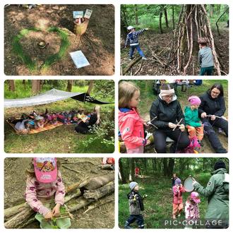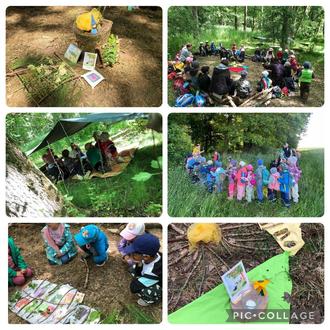 Es fühlt sich an wie ein Abenteuer und auch ein bisschen wie Urlaub. Mit vollgepacktem Rucksack und Bollerwagen losziehen- raus in die Natur, kennen wir von unserem wöchentlichen Naturtag am Freitag. Trotzdem fühlt es sich heute, an einem Montag, anders an. Vom Spielplatz in Maibach geht es los, über die Feldwege, in Richtung Wald. Wir achten darauf, auf den Wegen zu bleiben. Kleine Häschen, Rehkitze oder auch die Feldlerche haben gerade ihre Kinderstube im hohen Gras. Herr Döll, ein Jäger aus Maibach, war so nett, uns darauf aufmerksam zu machen. Den geeigneten Platz für unsere Waldwoche haben wir uns schon einige Wochen zuvor ausgesucht. Gelegen in einem wunderschönen verwunschenen kleinen Waldstück, das die Waldkörperschaft mit viel Liebe und Fürsorge pflegt und darauf achtet, dass kranke Bäume oder tote Äste vorsorglich entfernt werden. Hintereinander gereiht wie eine große Raupe, damit wir auch im Wald so wenig Pflanzen und kleine Bäumchen beschädigen, tauchen wir ein in das saftige Grün des Waldes, dass uns sogleich umschmeichelt und ruhig werden lässt. Sammelplatz ist ein großes Waldsofa, dass aus dem am Boden liegenden Hölzern schon im Vorfeld zu einem Kreis angeordnet wurde und uns als Sitzgelegenheit bei den Brotzeiten und Kreisen dienen soll. Kleine Rituale aus unserem Tagesablauf im Kinderhaus, möchten wir für unsere Waldwoche beibehalten. Und so beginnen wir auch den heutigen Tag mit einem Morgenkreis, in dem wir uns gegenseitig begrüßen, ein Lied singen und einfach mal dem Konzert der Vögel lauschen. Nach einer kleinen Brotzeit machen wir uns an die „Arbeit“. In kleinen Grüppchen fangen die Kinder an sie Höhlen, Tippis und Nester zu bauen. Dabei sind gegenseitige Absprachen, das gemeinschaftliche Tragen eines schweren Astes und konstruktives Geschick unumgänglich. Ein paar Kinder gehen auf Erkundungstour, immer in Sichtweite der Erzieher. Einer der festgelegten Regeln, die wichtig für unsere Zeit im Wald sind. Die Spur eines Ameisenstammes wird aufgenommen und verfolgt und auch der an dieser Stelle etwas sandig wirkende Waldboden wird genau unter die Lupe genommen. Wir Erzieher optimieren noch unseren Waldplatz und bauen gemeinsam mit ein paar Kindern ein Tarp - ein aus Folie und Expander gespanntes Zelt, dass uns später als Ruheinsel für unsere „Sternstunde“ dienen soll. Denn auch das ist wichtig. Arbeiten und Spielen an der frischen Luft macht müde. Und so gönnen wir uns nach dem Mittagessen eine kleine Auszeit. Kuscheln uns auf die mitgebrachten Picknickdecken und lauschen der erzählten Geschichte und den Geräuschen des Waldes. Zuvor feiern wir noch den Geburtstag eines Kindes. Einen „Wurzelthon“ für das Geburtstagskind haben wir im Wald gefunden. Ein Mädchen legt noch eine Sonne aus Hölzern und schmückt die Kreismitte mit Blumen und unseren Jahreszeitentüchern. Dieses besondere Geburtstagsfest wird uns und vor allem unserem Geburtstagskind lange in Erinnerung bleiben. Zum Glück haben wir unser neu gestaltetes Waldtagebuch, indem wir alles festhalten, was wir an den Tagen im Wald erleben. Gestaltet mit zauberhaft gemalten Bildern von den Kindern wird es unser kleiner Erinnerungsschatz durch dem wir die Waldtage immer wieder lebendig werden lassen können.