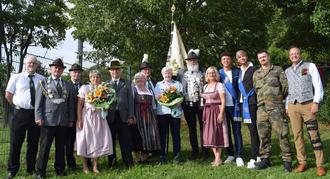 v. l. Gaupräsident Norbert Mahr, Schützenkaiser Peter König, Ehrenschützenmeister Dieter Nicola, Sabin und Johannes Zemelka, Gabi und Stefan Kohlinger, Christine Reichert, neuer Schützenkönig Michael Reichert, Landratskandidatin Gabi Jakob, Thorsten und Frank Fischer-Schmälzle, Major Schöne, 1. Bürgermeister Ludwig Nätscher