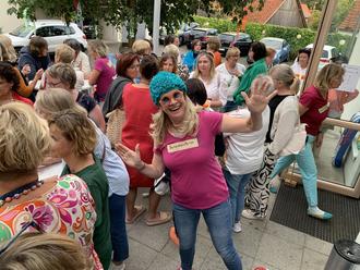 Sonja Haas, erste Vorsitzende des Frauenbundes Poppenhausen/Hain freute sich als selbsternannte „Bademeisterin“ (im Bild - mit Bademütze) über den regen Zuspruch zum Kinoabend im Pfarrhof. Gezeigt wurde die Komödie „Freibad“ von Doris Dörrie. In diesem Film wurden tatsächlich viele Themen, die Frauen betreffen auf äußerst amüsante Weise zur Sprache gebracht. Er spielt in einem Schwimmbad, in dem der Zutritt für Männer verboten ist.