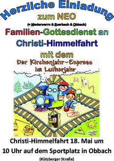 | 10.00 Uhr | gemeinsamer Familiengottesdienst der Evang. Kirchengemeinden Niederwerrn, Euerbach und Obbach auf dem Obbacher Sportplatz mit Familie Eider. Nach dem Gottesdienst laden wir zum gemütlichen Beisammensein mit Bratwurst und Getränken ein. |