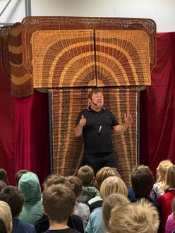 Kurz nach den Herbstferien erwartete die Kinder unserer Grundschule eine ganz besondere Überraschung. Ali Büttner besuchte uns mit seinem Korbtheater. Die Kinder staunten nicht schlecht, als sie die Turnhalle betraten und die eindrucksvolle Bühne erblickten. Gespannt und aufmerksam sahen wir das Stück „Volltreffer für Lutz“, in dem es darum geht, dass „Lutz, die Wutz“ den großen Wunsch hat, ein Fußballstar zu werden. Mit viel Humor und Spielfreude zeigte uns Herr Büttner, dass es sich immer lohnt, an seine Träume zu glauben!