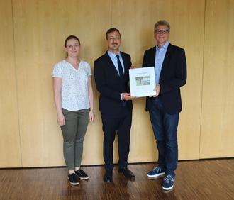 Im Bild von links: Johanna Graf (LAG-Managerin), Daniel Pascal Klaehre (LEADER-Koordinator für Unterfranken) und Ulfert Frey (LAG-Manager) bei der offiziellen Übergabe ihrer Bewerbungen für die LEADER-Förderperiode 2023 bis 2027 an den LEADER-Koordinator im Juli 2022. Foto: Andreas Ofenhitzer/AELF Bad Neustadt a.d.S.