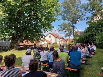 Ein großer Punkt bei dem Thema Bio-Verpflegung ist immer der Anfang: Wie hoch ist der Aufwand und welchen Mehrwert hat es für meine Einrichtung? Bernd Fischer und Agnes Sitzmann von der Umweltbildungsstätte Oberelsbach gGmbH stellten sich im lauschigen Garten von Gut Obbach souverän den Fragen der Teilnehmenden. Die Küche ist bereits bio-zertifiziert und es werden rund 80 Prozent regionale, saisonale, fair gehandelte sowie Bio-Produkte verwendet. Die beiden empfehlen: