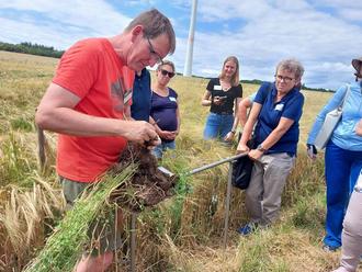 Gleich zu Beginn durften die Teilnehmenden ihre Hände dreckig machen. Es ging raus auf den Bio-Acker von Gut Obbach. Hier wachsen dieses Jahr Belugalinsen zusammen mit Gerste, wobei die Gerste als Stützfrucht dient und die Linsen über sogenannte Knöllchenbakterien Stickstoff aus der Luft binden. Dieses so wichtige Prinzip für den Ökolandbau, bei dem kein chemisch-synthetischer Stickstoff gedüngt werden darf, erläuterten die beiden Betriebsleitenden Petra Sandjohann und Bernhard Schreyer. Der Anbau von Linsen war für viele Teilnehmende neu, was die Begeisterung über die Entdeckung der nützlichen Knöllchenbakterien noch steigerte.