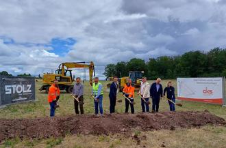 Spatenstich für den Baubeginn des neuen GKS-Abfallzwischenlagers am Abfallwirtschaftszentrum Rothmühle mit (von links) Stephan Orzol (stellvertretender Leiter des Abfallwirtschaftszentrums), Bernhard Stolz (Unternehmensgruppe Stolz), Klaus Bruhm (Planungsbüro ISK), Landrat Florian Töpper, Dr. Ragnar Warnecke (Geschäftsführer GKS), Thomas Fackelmann (Leiter Abfallwirtschaft Landratsamt Schweinfurt), Prof. Peter Möhringer (Bürgeraktion Müll und Umwelt) und Lisa Harth (GKS-Umweltingenieurin)