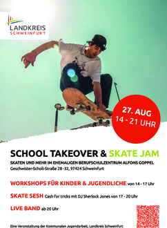 Nicht nur die Einweihung des BSZ-Neubaus war feierlich, auch der Abschied vom ehemaligen Schulgebäude soll angemessen gefeiert werden. Das Gebäude wird am 27. August zum Veranstaltungsort für ein ganz besonderes Skatekultur-Event für Kinder und Jugendliche. Die Veranstaltung der Kommunalen Jugendarbeit ist kostenfrei und es ist keine Anmeldung nötig. Am 27. August dreht sich am ehemaligen BSZ-Schulgebäude alles ums Skaten, um Graffiti und Breakdance. Ab 14.00 Uhr werden unter anderem Skate-Workshops angeboten. Dabei geben Profis Unterstützung und Tipps. Verschiedene Hindernisse zur individuellen Parcoursgestaltung hat das Skate-Mobil im Gepäck. Der Workshop richtet sich an eine breite Zielgruppe. Von Anfänger bis Vollprofi, jede und jeder ist willkommen. Leihmaterial, wie Skateboards, diverse andere Rollsportbretter, Helme und Schutzbekleidung werden vom Skate-Mobil kostenlos zur Verfügung gestellt, aber auch eigene Ausrüstung darf mitgebracht werden. Da bei den Skate-Workshops immer eine feste Personenzahl teilnehmen kann, finden weitere Workshops statt zum Thema Skatekultur. Auf dem Programm stehen an diesem Tag auch ein Graffiti-Workshop, Hip-Hop/Rap und ein Breakdance-Workshop von der DDC Factory aus Schweinfurt. Ganz ohne Skateboard geht das Austoben auf der Hüpfburg vor Ort. Der zweite Teil des Nachmittags richtet sich an die ältere Zielgruppe. Bei „Cash for tricks“ werden Skateboard- oder Stunt-Scooter-Tricks prämiert und ein DJ begleitet alles vor Ort. Ab 20 Uhr spielt eine Band Live-Musik und sorgt für einen entspannten Ausklang des Tages.