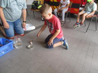 Unter der Aufsicht des Feuerwehrmannes Herrn König, durften die Kinder mit Feuer experimentieren, danach wurde der Notfallanruf geübt. Zum Schluss gab es eine Rundfahrt mit dem Feuerwehrauto, natürlich mit Sirene!