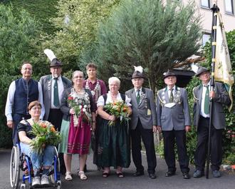 Im Bild hinten von links: 1. Bürgermeister Ludwig Nätscher, Schützenmeister Franz-Josef Sittler, Jugendkönig Jasper Hack, im Bild vorne von links: ehemalige Schützenkönigin Martina Bassing, Schützenkönigin Ute Sittler, ehemalige Schützenkaiserin Doris Nicola, Ehrenschützenmeister Dieter Nicola, Schützenkaiser Peter König, Fahnenträger Stefan Kohlinger Foto: Alexander König