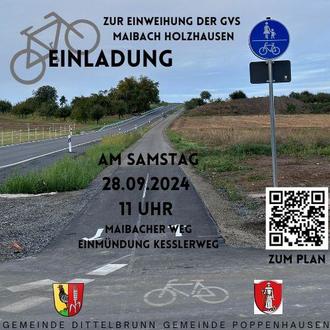 Herzliche Einladung an alle Bürgerinnen und Bürger zur feierlichen Einweihung der Gemeindeverbindungsstraße und dem Radweg zwischen Holzhausen und Maibach am Samstag, 28.09.2024 um 11.00 Uhr (Treffpunkt Maibacher Weg/Einmündung Keßlerweg). Gerne dürfen Sie – passend zum Anlass - mit dem Fahrrad kommen.