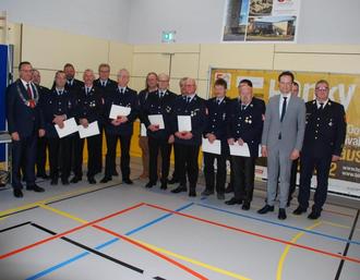 Für die Treue zu den Feuerwehren der sechs Dörfer zeichnete Landrat Töpper beim Neujahrsempfang der Gemeinde Poppenhausen verdiente Floriansjünger aus. Eine ganze Reihe von Feuerbekämpfern hilft seit 25 Jahren mit, auch die Gruppe der Jubilare mit 40jähriger Treue zu den Wehren war groß.