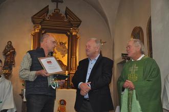 Als Dankeschön wurde Hr. Erhard von Pfarrer Johannes Messerer und vom Vertreter der Kirchenverwaltung und des Pfarrgemeinderates Hain, Herrn Alexander Iff, die Ehrennadel des Bistums Würzburg übergeben.