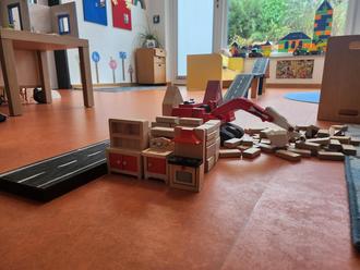 Im Gruppenraum „Bauarbeiterland“ können sich die Kinder mit verschiedenen Materialien zum Bauen und Konstruieren beschäftigen.