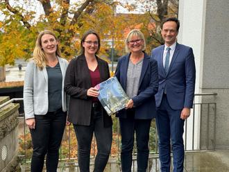 Freuen sich über das fertiggestellte Alltagsradverkehrskonzept des Landkreises Schweinfurt (von links): Johanna Graf (Kreisentwicklung), Eva Mast (Projektleitung Büro topplan), Radverkehrsbeauftragte Ursula Schmidt und Landrat Florian Töpper