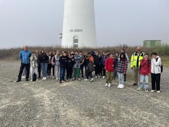 Am Freitag, den 06.10.2023, fuhren die Klassen 7a und M7 zum Windpark nach Schwanfeld, um sich über die Windkraft zu informieren. Vor Ort am Windrad nahm uns Herr Köth, der ehemalige Bürgermeister von Schwanfeld, in Empfang und nach der Messung der Lautstärke sowie der Windgeschwindigkeit, erhielten wir viele Einblicke in die Geschichte von Schwanfeld und in die Errichtung des Windparks in der Gemeinde. Herr Köth informierte uns auch über einige beeindruckende Daten zu den Windrädern. So könnte man beispielsweise die komplette Gemeinde Schwanfeld mit 1,25 von den ca. 150 m hohen vor Ort stehenden Windrädern das ganze Jahr über mit Strom versorgen, wenn denn der Wind immer blasen würde.