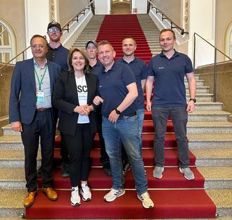 v. links nach rechts: Bürgermeister Ludwig Nätscher, Benedikt Heuß, Martina Gießübel MdL, Cindy Dänner, Alexander König, Christian Weck und Michael Pun am Treppenaufgang im Maximilianeum