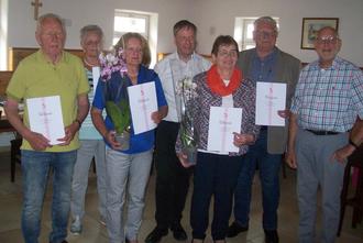 die geehrten von links Georg Nagengast, Christa Kohlmann, Monika Nagengast, Pfarrer Matthias Steffel, Barbara u. Bernhard Steger und Franz Klement