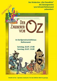Im Rahmen des 100-jährigen Jubiläums präsentiert der Kinderchor, die „Chorallinis“, das Musical „Der Zauberer von Oz" am Samstag, 22.07.23 um 17.00 Uhr und am Sonntag, 23.07.23 um 15.00 Uhr im Dorfgemeinschaftshaus Rothensand. Der Eintritt ist frei und für das leibliche Wohl ist gesorgt. Lassen Sie sich von der Magie der Musik und der bezaubernden Geschichte mitreißen und genießen Sie einen unvergesslichen Nachmittag voller Freude und Fantasie.
