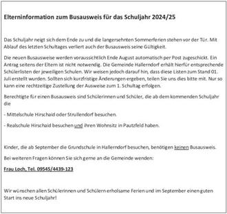 Die neuen Busausweise werden voraussichtlich Ende August automatisch per Post zugeschickt. Ein Antrag seitens der Eltern ist nicht notwendig. Die Gemeinde Hallerndorf erhält hierfür entsprechende Schülerlisten der jeweiligen Schulen. Wir weisen jedoch darauf hin, dass diese Listen zum Stand 01. Juli erstellt wurden. Sollten sich kurzfristige Änderungen ergeben, teilen Sie uns dies bitte mit. Nur so kann eine rechtzeitige Zustellung der Ausweise zum 1. Schultag erfolgen.